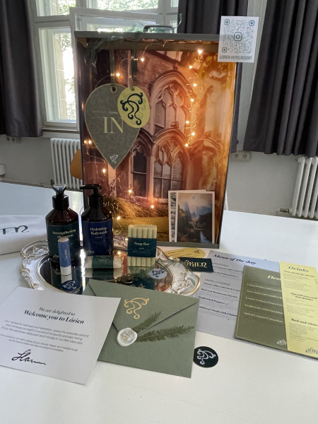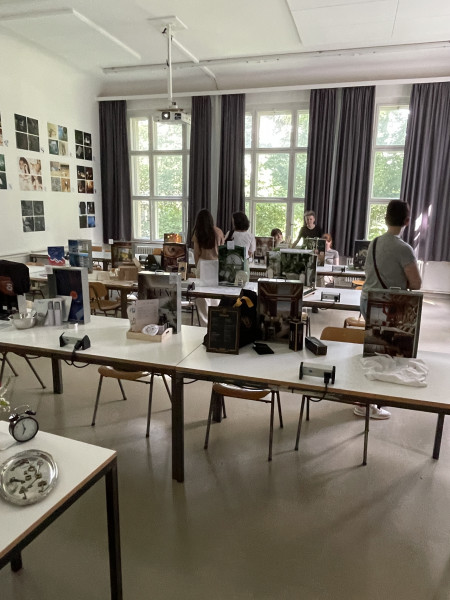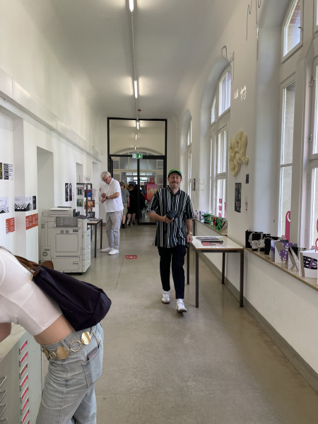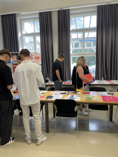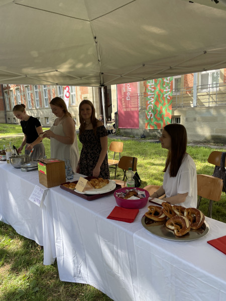 In den Klassenzimmern im Schulhaus des Merz Berufskollegs fand die große Ausstellung der Schüler*innen-Arbeiten statt. Alle Klassen hatten ihre Arbeiten ausgestellt. Auch in diesem Jahr waren wieder die Abschlussarbeiten der Klasse 3 zu sehen. Draußen im Park waren während dessen die Festlichkeiten bei sommerlichen Temperaturen in vollem Gang. Für das leibliche Wohl hatten die Schüler*innen der Klasse 1 an einem liebevoll gestalteten Stand mit viel Selbstgebackenem wie frischen Waffeln, Pizzaschnecken und Zitronenmuffins gesorgt.